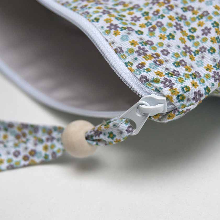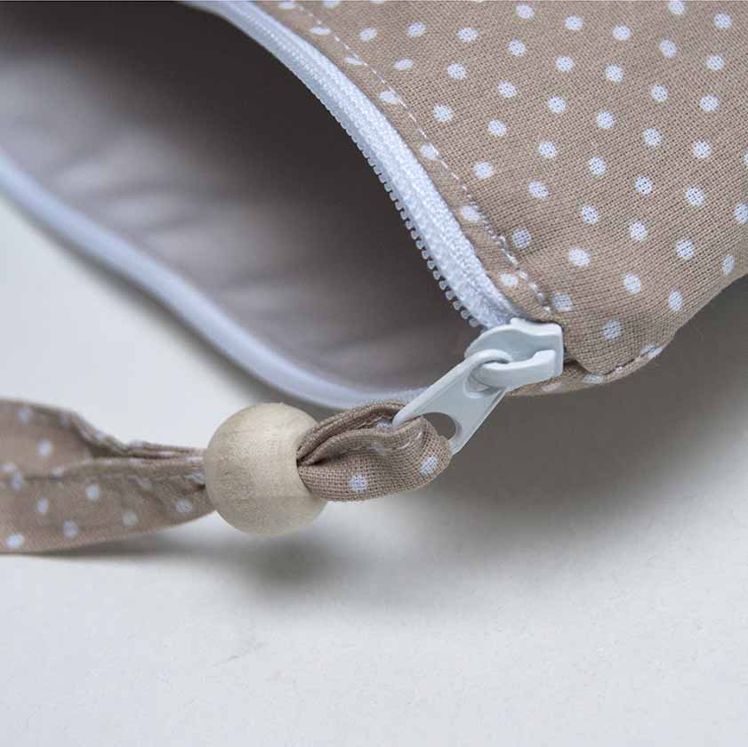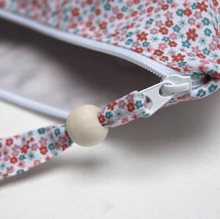 Elle se ferme par une fermeture à glissière. Une perle en bois naturel, montée sur un ruban du même tissu à motif que la trousse est fixée au curseur de la fermeture.